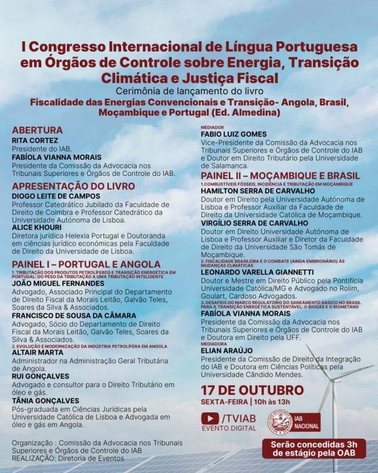 O Instituto dos Advogados Brasileiros (IAB) realizará, na sexta-feira (17/10), às 10h, o I Congresso Internacional de Língua Portuguesa em Órgãos de Controle sobre Energia, Transição Climática e Justiça Fiscal. Na ocasião, será lançado o livro Fiscalidade das Energias Convencionais e Transição – Angola, Brasil, Moçambique e Portugal, com apresentação dos autores: o professor catedrático jubilado da Faculdade de Direito de Coimbra Diogo Leite de Campos e a diretora jurídica da Helexia Portugal, Alice Khouri. O evento será transmitido pelo canal TVIAB no YouTube.