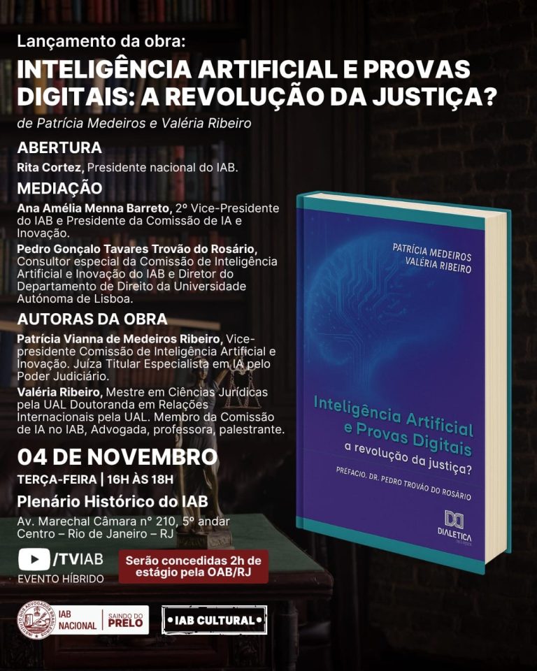 As novas tecnologias e os algoritmos estão remodelando a prática jurídica – esta é a premissa de investigação, pesquisa e debate do livro Inteligência artificial e provas digitais: a revolução da Justiça?, que será lançado pelo Instituto dos Advogados Brasileiros (IAB) nesta terça-feira (4/11), às 16h. O evento, promovido pelo projeto Saindo do Prelo, contará com a participação das autoras, Patrícia Vianna de Medeiros Ribeiro e Valéria Ribeiro. Com transmissão ao vivo pelo canal TVIAB no YouTube, o debate será aberto pela presidente nacional da entidade, Rita Cortez.