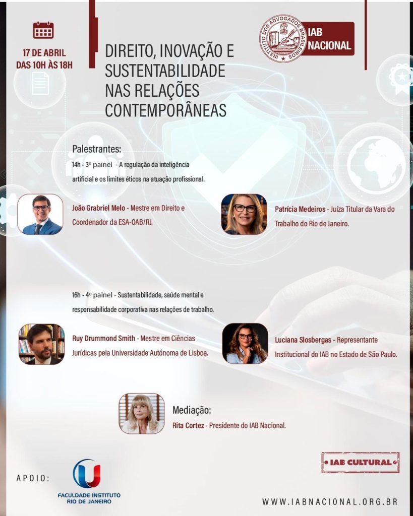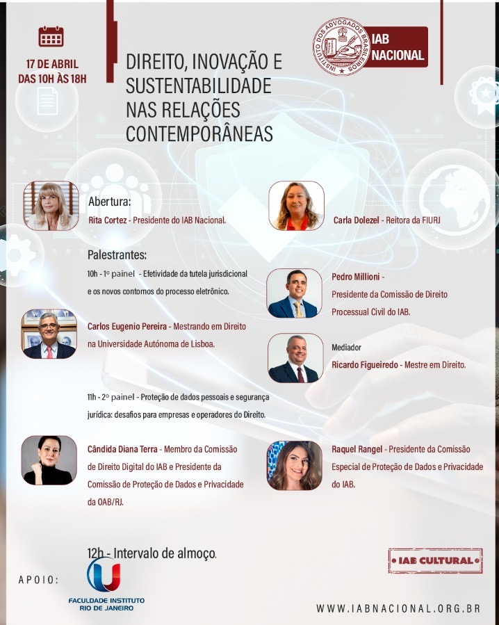 Direito, inovação e sustentabilidade nas relações contemporâneas é o tema do evento que será realizado pelo Instituto dos Advogados Brasileiros (IAB) no dia 17 de abril, às 10h, na Faculdade Instituto Rio de Janeiro (Fiurj), localizada à Avenida Rio Branco, 277, Centro – Rio de Janeiro. O debate será transmitido ao vivo pelo canal TVIAB no YouTube e terá abertura feita pela presidente nacional do IAB, Rita Cortez, e pela reitora da Fiurj, Carla Dolezel.