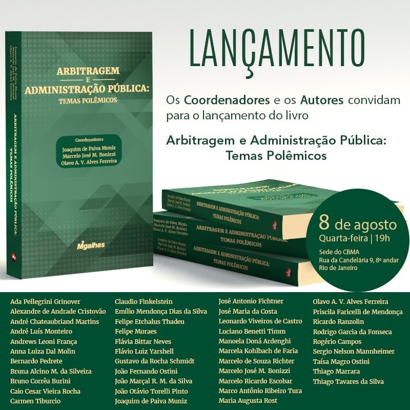” O Lançamento do livro “Arbitragem e Administração Publica: Temas Polêmicos”, acontecerá no dia 08 de agosto na sede do CBMA. O lançamento é parte da programaçãodo III Congresso Internacional CBMA de Arbitragem e ocorrerá junto com um pré-evento a ser organizado pelo CJA – Comitê de Jovens Arbitralistas. “