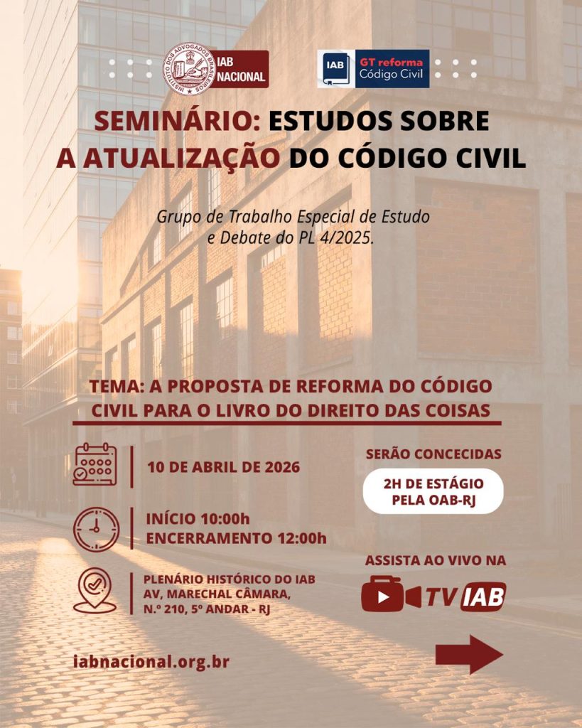 A proposta de reforma do Código Civil para o Livro do Direito das Coisas será tema de debate no seminário Estudos sobre a atualização do Código Civil, promovido pelo Instituto dos Advogados Brasileiros (IAB) nesta sexta-feira (10/4), às 10h. O evento, que terá transmissão ao vivo pelo canal TVIAB no YouTube, será aberto pela presidente nacional do IAB, Rita Cortez, e pela presidente da Comissão da Advocacia nos Tribunais Superiores e Órgãos de Controle, Fabíola Vianna Morais.