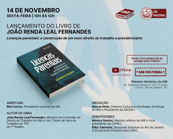 Como compatibilizar a tarefa de cuidar das crianças em seus primeiros meses de vida e o trabalho remunerado que garante o sustento familiar? Este é o desafio social posto em análise no livro Licenças parentais: a construção de um novo Direito do Trabalho e Previdenciário, que será lançado no Instituto dos Advogados Brasileiros (IAB) nesta sexta-feira (14/11), às 10h. O evento, promovido pelo projeto Saindo do Prelo, terá a participação do autor, o juiz do Tribunal Regional do Trabalho da 1ª Região (TRT-RJ) João Renda Leal Fernandes. A transmissão acontecerá pelo canal TVIAB no YouTube.