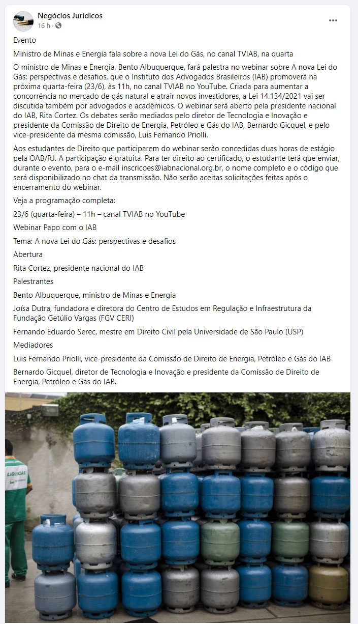 Ministro de Minas e Energia fala sobre a nova Lei do Gás, no canal TVIAB, na quarta