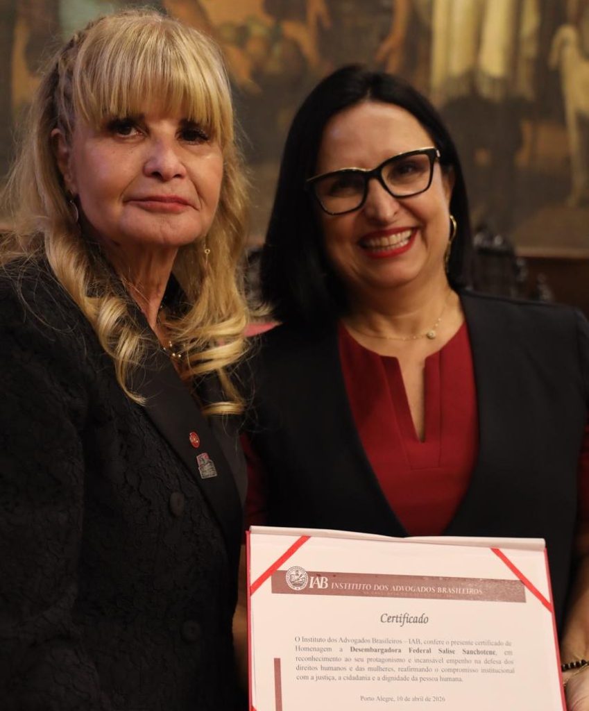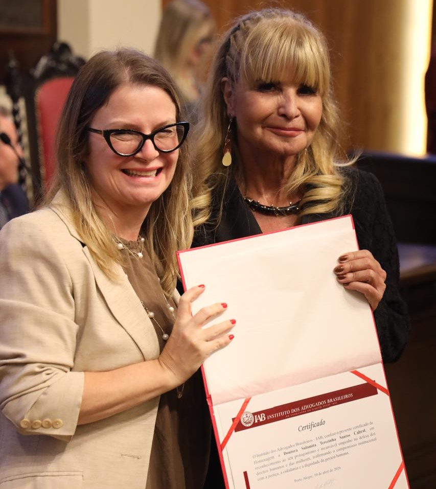 Por motivo de saúde do marido, a presidente do Instituto dos Advogados do Rio Grande do Sul (Iargs), Sulamita Cabral, também agraciada com a homenagem, não pôde comparecer ao evento. Ela enviou uma carta, lida na ocasião, em que destacou a “honra em ser homenageada junto com mulheres proeminentes no mundo jurídico”, e transmitiu abraços e seu agradecimento à diretoria do IAB. Quem recebeu o diploma em nome de Sulamita foi a diretora do Iargs Ana Amélia Prates.