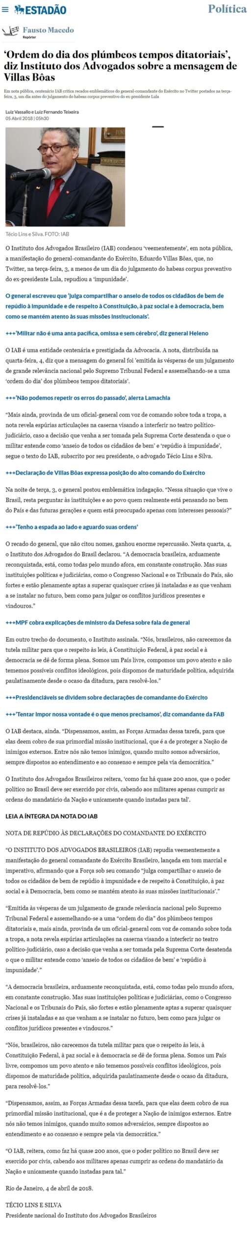 ‘Ordem do dia dos plúmbeos tempos ditatoriais’, diz IAB sobre mensagem de Villas Bôas