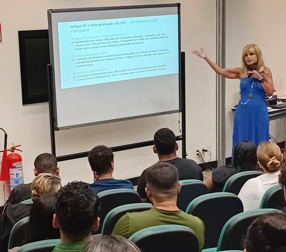 Na apresentação, Cortez destacou a centralidade dessas normas na proteção de direitos, enfatizando que tratados e convenções não são apenas instrumentos diplomáticos, mas verdadeiras fontes normativas. Nesse sentido, ela apontou que convenções, especialmente as da Organização Internacional do Trabalho (OIT), atuam diretamente na legislação interna. Segundo a advogada, esses instrumentos possuem diferentes níveis hierárquicos, podendo alcançar status de emenda constitucional ou status supralegal, o que evidencia sua força normativa e impacto na aplicação do Direito no País.