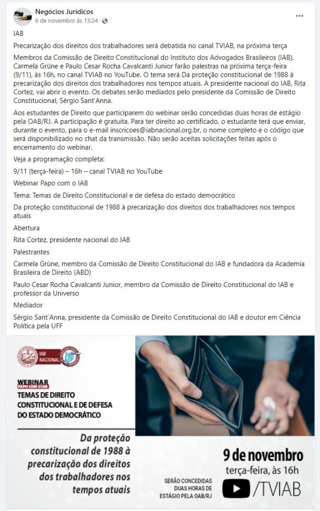 Início » IAB na imprensa » Precarização dos direitos dos trabalhadores será debatida no canal TVIAB, nesta terça