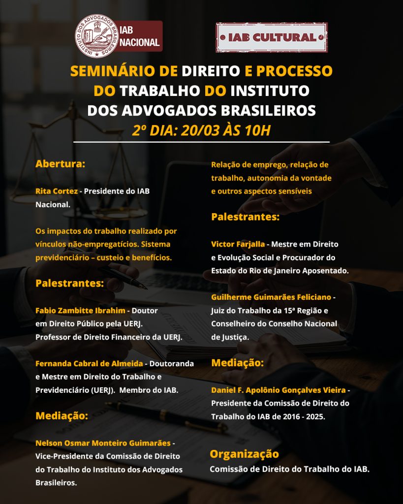 No segundo dia, o seminário terá o painel Os impactos do trabalho realizado por vínculos não-empregatícios, com exposições do professor de Direito Financeiro da Universidade do Estado do Rio de Janeiro (Uerj) Fabio Zambitte Ibrahim e da doutoranda e mestre em Direito do Trabalho e Previdenciário pela mesma instituição Fernanda Cabral de Almeida. A mediação será do vice-presidente da Comissão de Direito do Trabalho do IAB, Nelson Osmar Monteiro Guimarães.