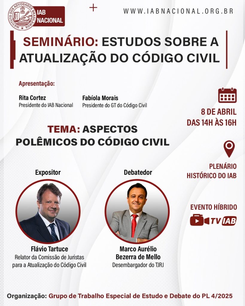Os aspectos polêmicos a respeito do projeto de lei 4/25, que materializa a reforma do Código Civil, serão apontados pelo relator-geral da Comissão de Juristas para a Atualização do Código Civil, Flávio Tartuce, em evento do Instituto dos Advogados Brasileiros (IAB). O encontro acontecerá na próxima quarta-feira (8/4), às 14h, e terá transmissão ao vivo pelo canal TVIAB no YouTube. O grupo do qual o palestrante faz parte foi criado pelo Senado Federal em 2023 para revisar e modernizar o diploma legal.