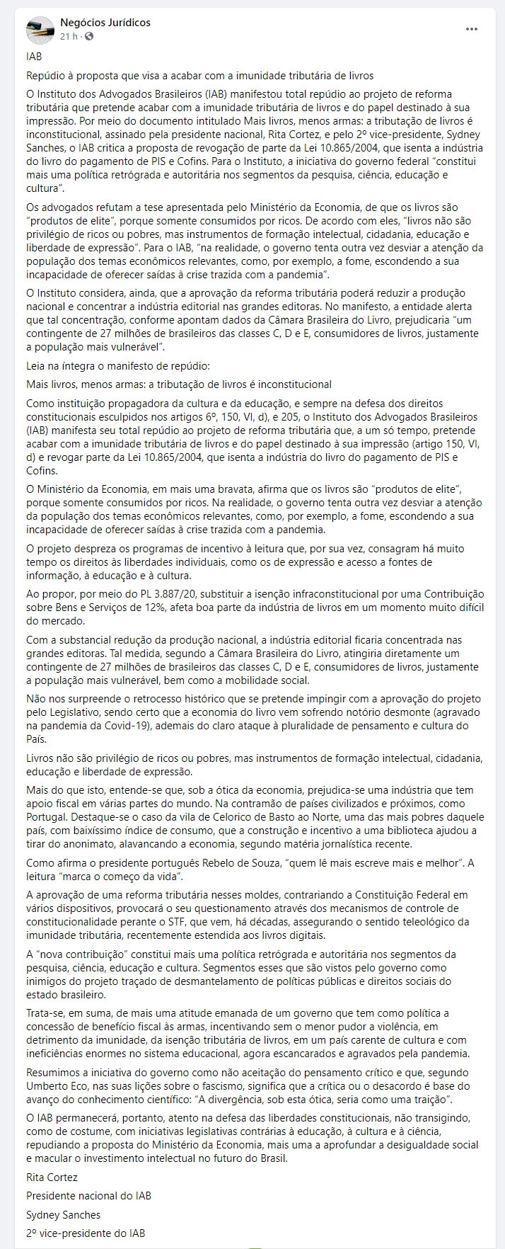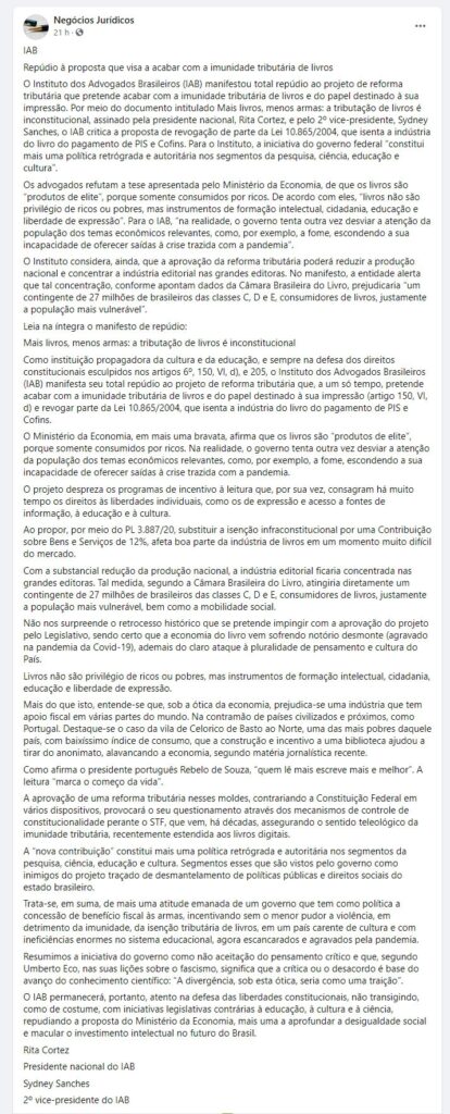 Início » IAB na imprensa » Repúdio à proposta que visa a acabar com a imunidade tributária de livros