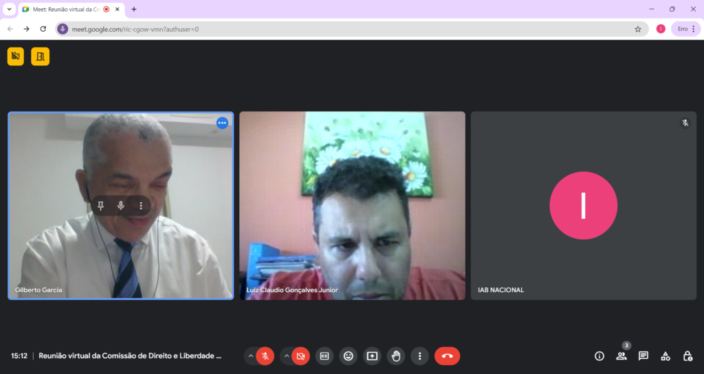 A Comissão de Direito e Liberdade Religiosa-IAB/Nacional reunida virtualmente em 09/09/2024, 2ª Feira, as 15h05, através da Plataforma ‘Google Meet’ disponibilizada pelo Setor de Tecnologia do IAB/Nacional, Av. Marechal Câmara, 210, 5º Andar, Centro, Rio/RJ, sob a Presidência do Dr. Gilberto Garcia, e, Contando com a Participação Eletrônica: Dr. Luiz Claudio Gonçalves Junior (Guaratinguetá/SP), Anotando-se a Justificativa de Ausência dos Membros: Dr. Carlos Schlesinger (1º Vice-Presidente), Dr. Vitor Pimentel Pereira, Dra. Maria Elizabeth da Silva Nunes, e, Dra. Laura Berquó (João Pessoa/PB), tendo sido Apreciado o Item Único da Pauta, pelos Membros Presentes na Reunião: 005/2024, Bimensal Virtual, deste dia: