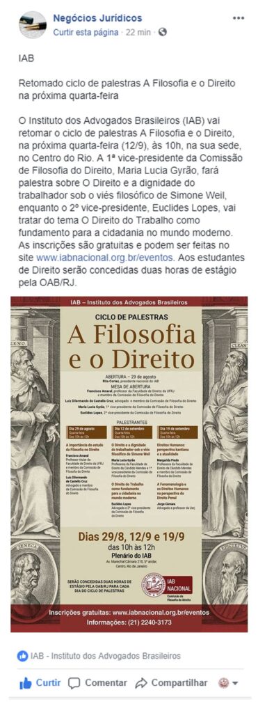 Início » IAB na imprensa » Retomado ciclo de palestras A Filosofia e o Direito na próxima quarta-feira