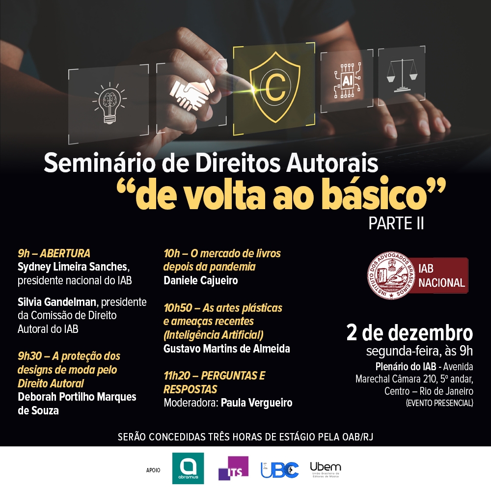 Início » Eventos » Eventos Institucionais » 2024 » Dezembro 2024 » Seminário de Direitos Autorais – “de volta ao básico” – PARTE II