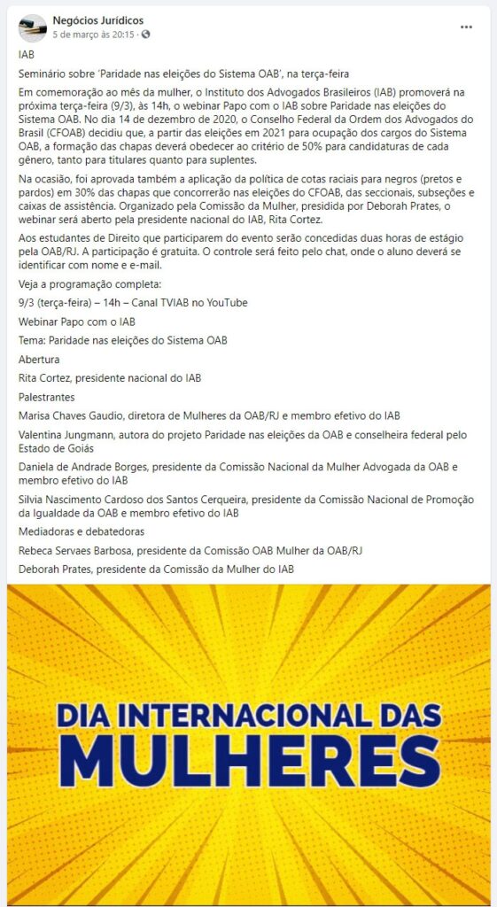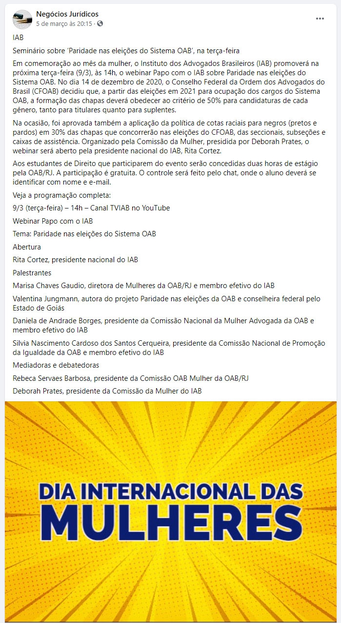 Início » IAB na imprensa » Seminário sobre ‘Paridade nas eleições do Sistema OAB’, na terça-feira