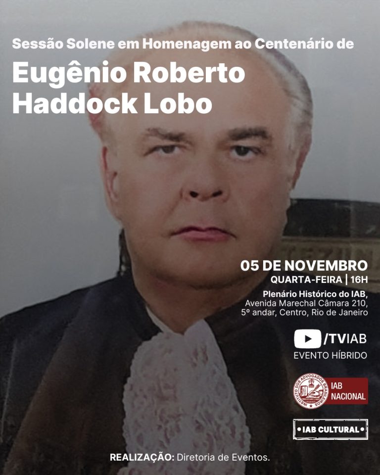 O centenário de Eugênio Roberto Haddock Lobo será celebrado pelo Instituto dos Advogados Brasileiros (IAB) em sessão solene realizada na próxima quarta-feira (5/11), às 16h. A homenagem ao jurista acontecerá no Plenário Histórico da Casa de Montezuma, localizado à Avenida Marechal Câmara 210, 5º andar, no Centro do Rio de Janeiro. A cerimônia será transmitida pelo canal TVIAB no YouTube.