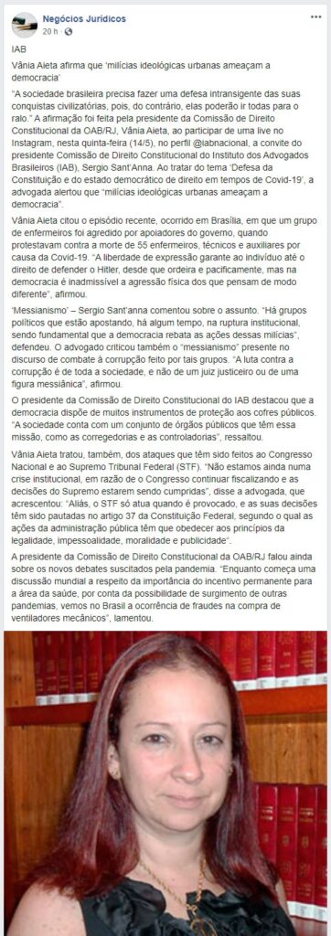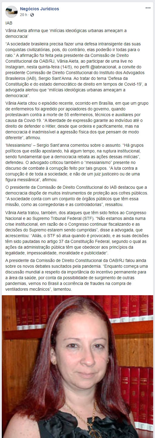 Início » IAB na imprensa » Vânia Aieta afirma que ‘milícias ideológicas urbanas ameaçam a democracia’